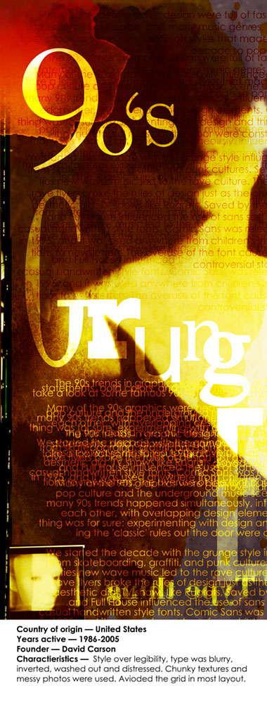 Continuing my series of design movements through the ages, we arrive at the mid 80’s through early aughts. Big thanks to David Carson for showing us how to be messy again